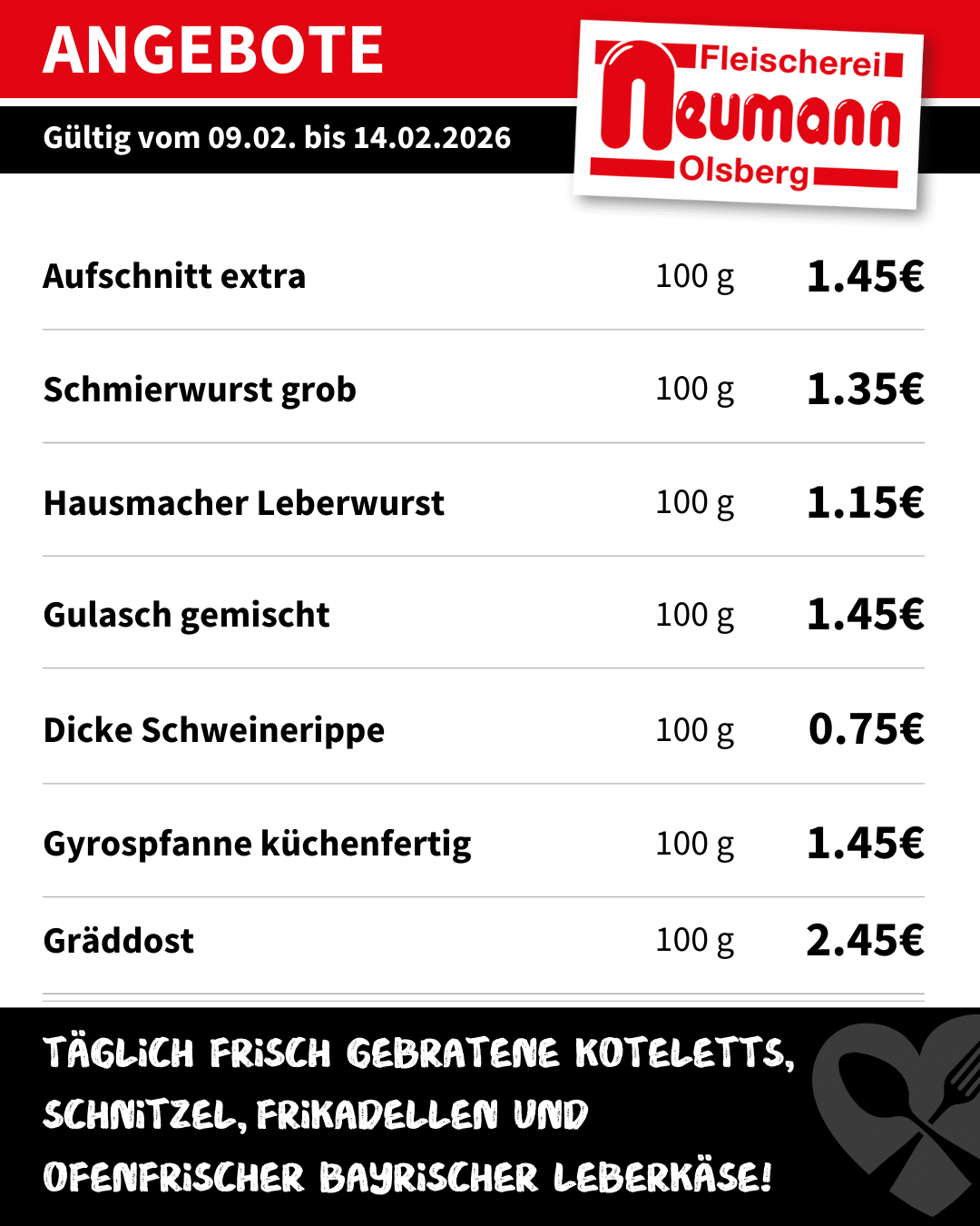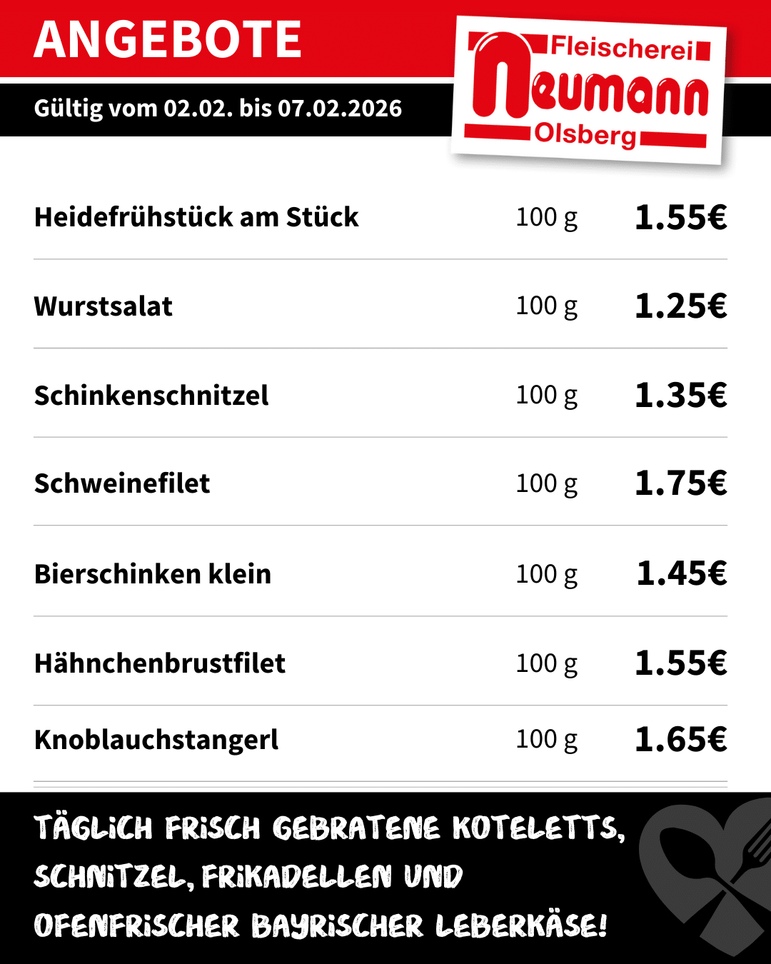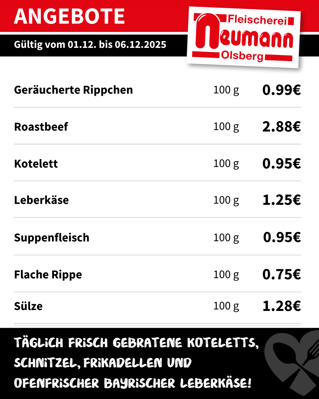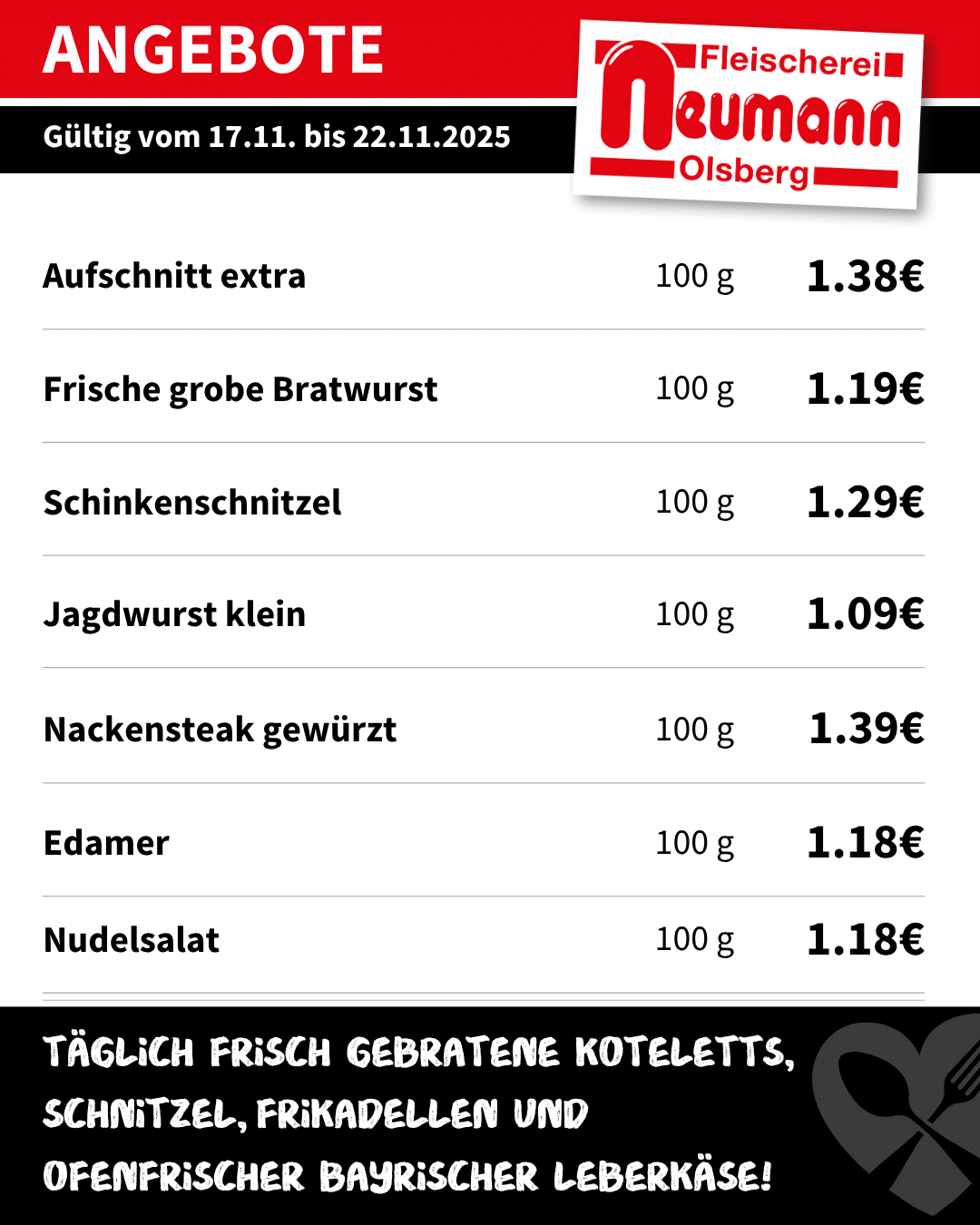 Wir bieten Ihnen wöchentlich eine Vielzahl an Angeboten aus unserer Ladentheke. Die aktuellen Angebote finden Sie auch bei uns in unseren Social Media-Kanälen und als kleinen Flyer zum Mitnehmen bei uns im Laden.